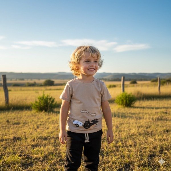 REMERA DE ALGODÓN CON ESTAMPA DE TRACTOR Y BOLSILLO